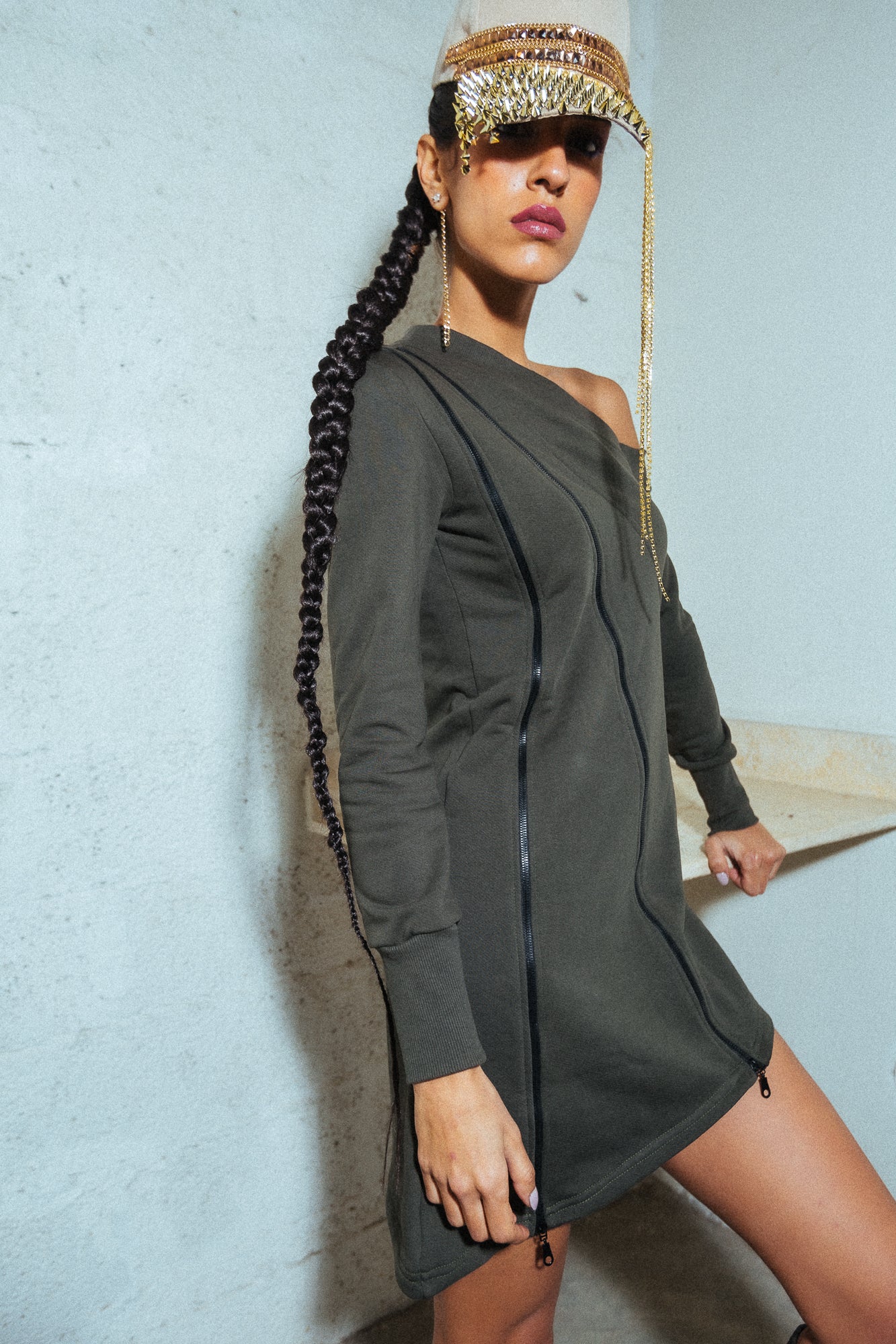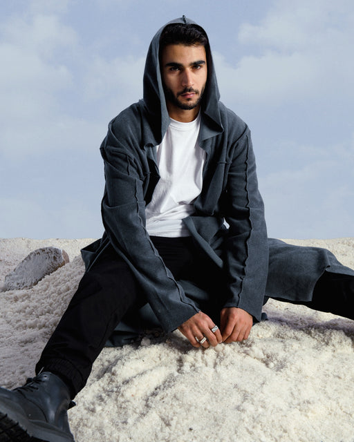 Loose fit, cashmere unisex cardigan with an irregular cut and a pocket on the left to give extra warmth on the cold days. Features an exaggerated hoodie attached at the neckline