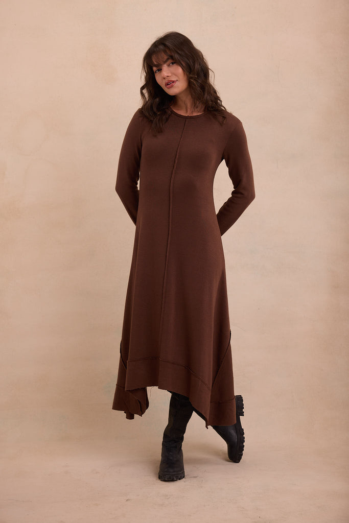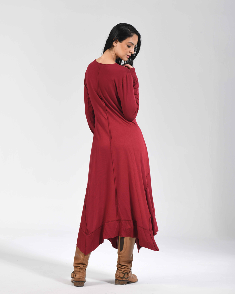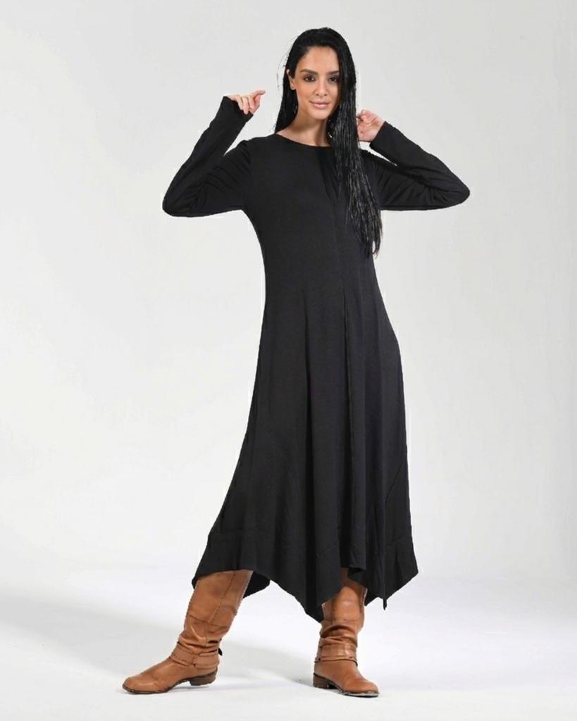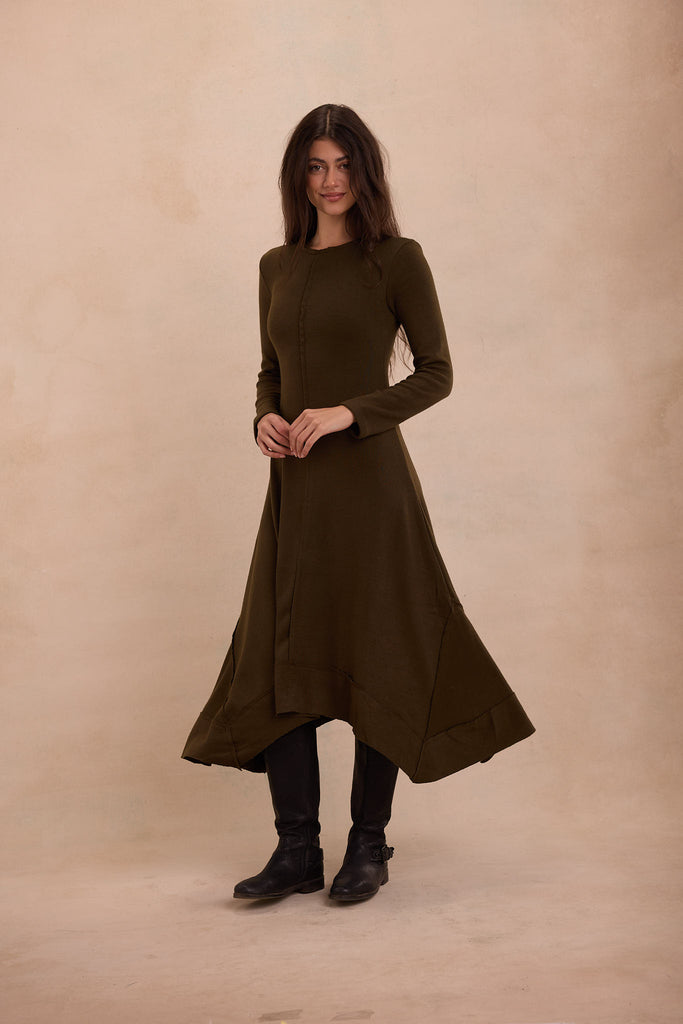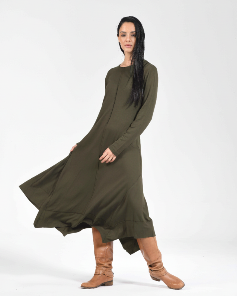 The reversed seam Flowline Maxi Dress showcases outward stitching and an intentionally uneven hem, giving a classic long dress an architectural twist. Every angle reveals subtle shifts—lines that don’t conform, seams that express rather than conceal.