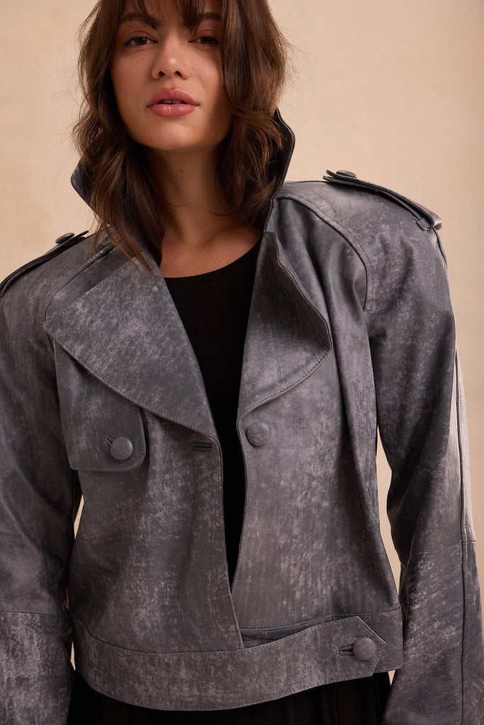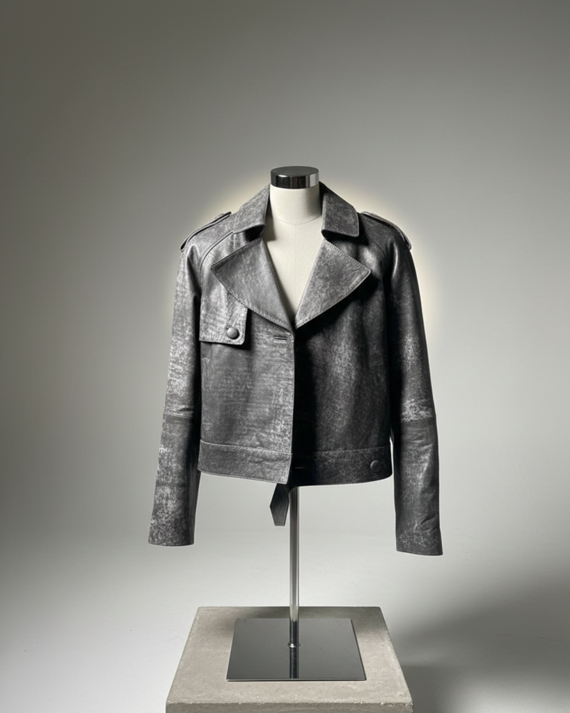 A cropped leather layer built for impact. With its washed metallic tone and streamlined shape, The Ironveil Leather Jacket adds instant depth and cool to any outfit. Understated buttons, structured shoulders, and a soft-matte texture create a piece that’s both iconic and timeless.