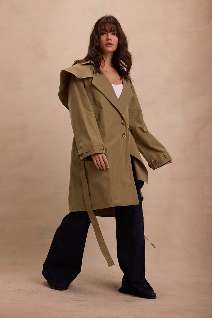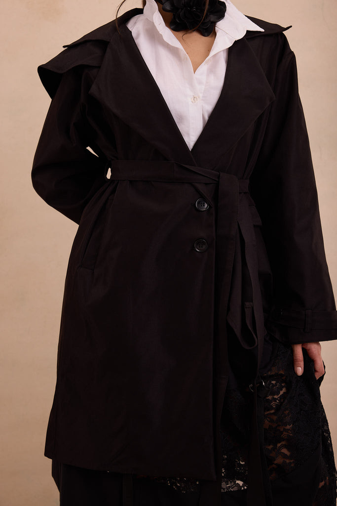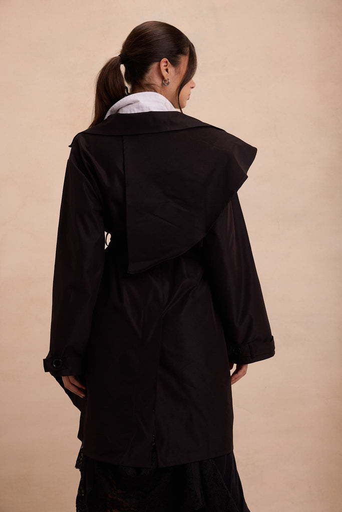 A modern trench reimagined. Where precision meets poetry. This trench coat is cut with commanding shoulders and a dramatic layered front, dissolving into fluid drapery that shifts as you move. Belted at the waist, it frames the body with quiet authority.